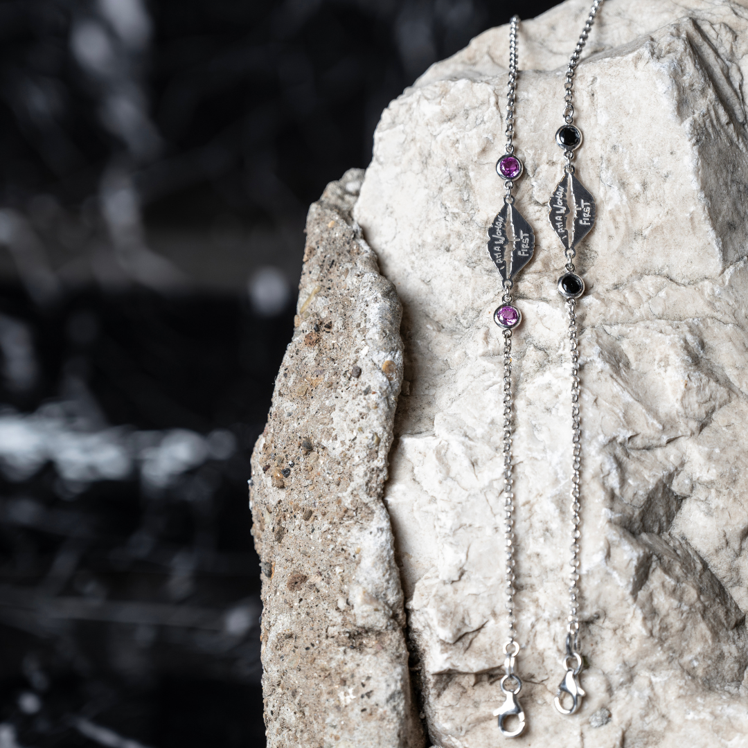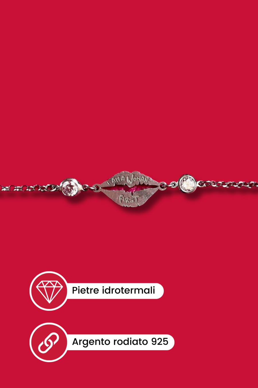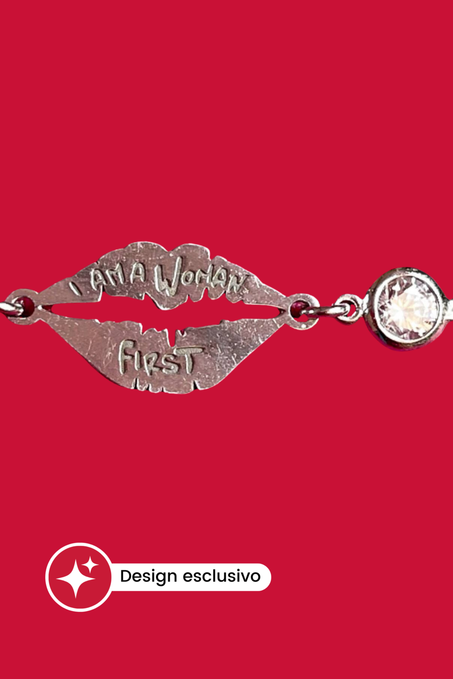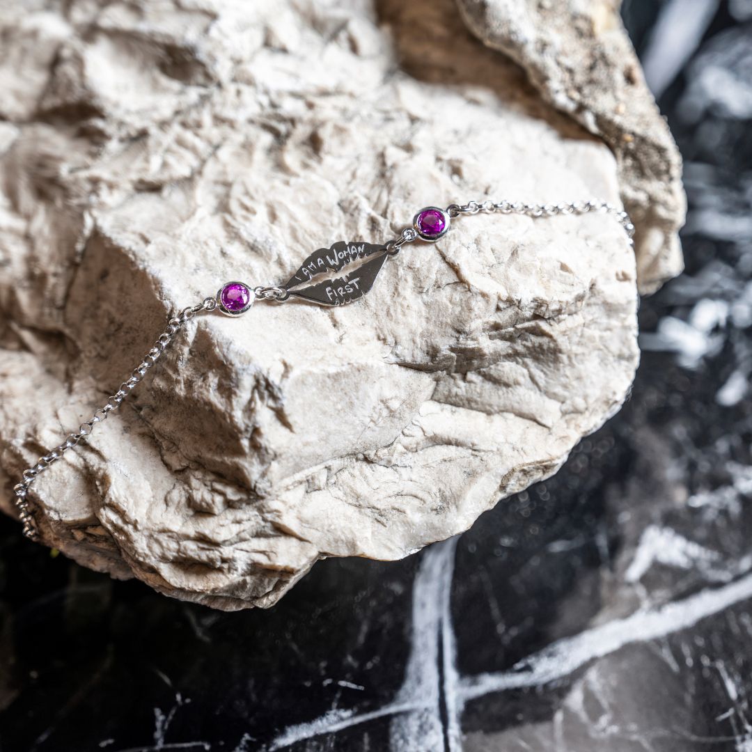 Il simbolo di “I Am A Woman First” è impreziosito da due pietre idrotermali disponibili in tre tonalità diverse: crystal, nero, fucsia.